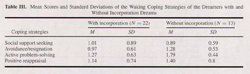 Mean scores and standard deviations of the waking coping strategies of the dreamers with and without incorporation dreams.