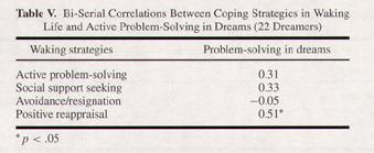 As the dream negative emotions and active problem-solving were dichotomous variables, point bi-serial correlations with the same waking measures were performed. The negative relation between negative emotions in the two states was significant rbs = -0.42, p<0.05). The same test was performed for each coping strategy in waking and active problem-solving in dreams, with an adjusted significance level of α = 0.0125, in view of the number of comparisons. One of the correlations, between positive reappraisal in waking and active problem-solving in dreams, was significant, as can be seen on Table V. The other results are also presented on the same table. With these two significant results, partial support for Hypothesis 3 was therefore provided.