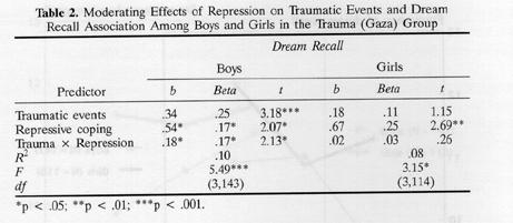 Table 2. Moderating Effects of Repression on Traumatic events and Dream Recall Association among Boys and Girls in the Trauma (Gaza) Group