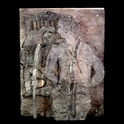 Sword Medium: Mixed Media,15 ½ by 12 by 4 inches Date Created: 2009 This is a mixed media piece. It contains calligraphic intaglio prints made on handmade Japanese washi. The completed prints are dipped in encaustic and mounted in separated layers on a wood backing. The dream this depicts: DREAM 8-9-08 TAKING UP THE SWORD I am at a conference. There is a woman who has to leave and die, and it falls to kill her. I will have to run her through with a sword, and I am not pleased that I have to do this, but it will be fine, there are no real bad feelings here about it. She decides to leave/die on her own, so that is a relief. A Japanese warrior shows up and his son is there also. Then his wife shows up. It seems that they live separately and have separate lives and there is something secret about their marriage. She is very exotic and beautiful. She may be Indian and dresses in veils of clothing and has large eyes that see through you. The Japanese warrior refuses to take up his sword. I am with him in a bedchamber and I am trying to talk him into taking the sword and being the warrior that he has trained to be. His sword is at the foot of the bed, erect, and I press up against it, his sword between my legs. Somehow being in contact with his sword is a way for me to commune with him in his dreams. He is asleep as I talk to him. He is dreaming, and I talk to him in his dreams. I dream into his dream. The son, meanwhile, is out in the world, which is this giant circle of open outdoor space with an earthen floor. It is like an arena of some sort with a wooden circled edge and he is dancing proudly with his Samurai sword. I step into the arena and we engage in a ceremonial confrontation. (Meanwhile,. I am also still at the foot of the bed dreaming with the father). We circle and circle until we know each other and then we do battle. I gracefully run the son through with my sword. There is no anger in the killing. He dies gracefully and bloodlessly. This is the son of both the Japanese warrior and the exotic wife. It is a secret that they have had this son together. When I kill the son, the mother, who has also been asleep and dreaming, wakes up with a start, fully knowing somehow that her son has been killed at that instant. Meanwhile, I am in the bedchamber with the father and the ghost of the son appears in the room at the left side of the sleeping father. He is in spirit form- sort of like a see-through cloud and he has a ghost sword. The sleeping Samurai’s sword is exactly like the ghost sword the ghost son holds in his hand. The son takes his ghost sword and slides it into the warrior sword, as though the ghost sword is the spirit inside the physical sword. There is some sort of force field disturbance when this occurs. The father wakes up and sees him and realizes that he now has to pick up the sword and be the warrior that he has always been. As the father wakes, it jolts me awake. |
