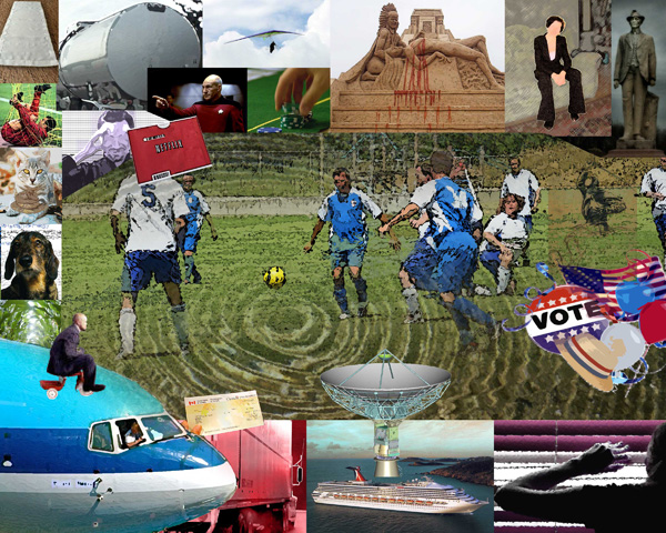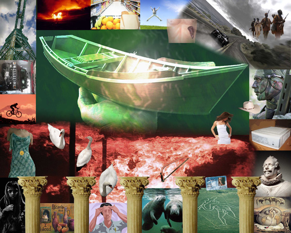| Introduction: Late 2006 I started adding a picture a day whenever I logged dreams. It started out as a temporary project of only a month, where I set out to log dreams every single day with the intention to track all ongoing themes from night to night for a whole month. The addition of images was supposed to enable a broader and more inclusive way of capturing dreams. Having imagery for all days with dreams also opened the way for other creative projects. Late 2007 and early 2008 I created three mosaics to see what kind of overview it would give me for a month of dreams I want to say that picking a good image for every single dream can be challenging at times. Trying to nicely combine some 30 images in a mosaic presents another challenge. However, nearly all the images in the mosaics are the originals I picked or created for the individual dreams. Title of Work: Much Fire and a Boat Medium: Digital Collage Date Created: October 2007 The visual representation of dreams show a different story than the textual descriptions. In October 2007 I logged at least one dream a day along with an image. When putting them all together in a mosaic two dreams ended up in the middle. The fire dream had a complex story ending in an underground area supported by pillars. Humanoids, but not humans, were about to put out fire with water to create gold. The boat dream featured the archetypical ferryman, shooting his boat out of the water across a road and then stopping next to me. The shape of the boat allowed it to carry lots of equipment and machinery. |