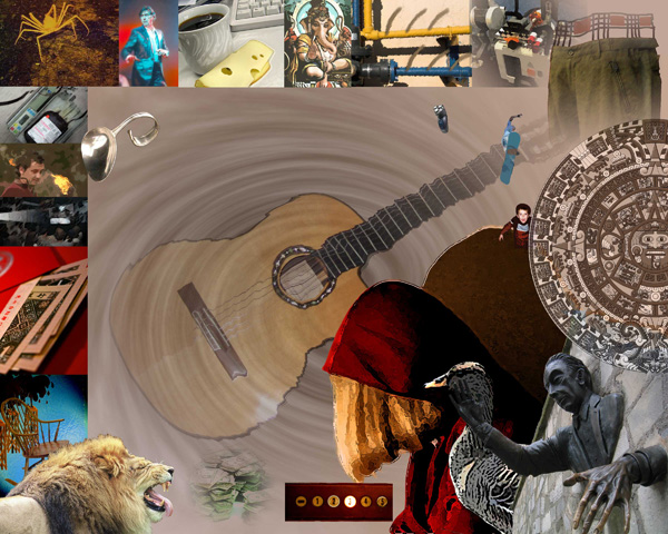 and the Time Guitar Medium: Digital Collage Date Created: November 2007 For November I used the same recipe of at least one dream with a picture a day, with the pictures going into the mosaic. For the main dream I should have logged the sound, although that would have been impossible. A guitarist demonstrated how he could compress and otherwise manipulate time by using sound. The dream impressed me much but upon waking I simply could not translate the dream into any familiar concepts. The red hooded girl and the goose both come from a dream about a house with four small and shy ghosts. Somewhere around the time of this dream I had seen a few tv episodes about ghost hunters. The one time they actually may have encountered a ghost, they ran away screaming. I found that highly amusing. Apparently I decided to find a few ghosts myself in this dream. I discovered that actually seeing them this clearly indeed puts your nerves to the test. |