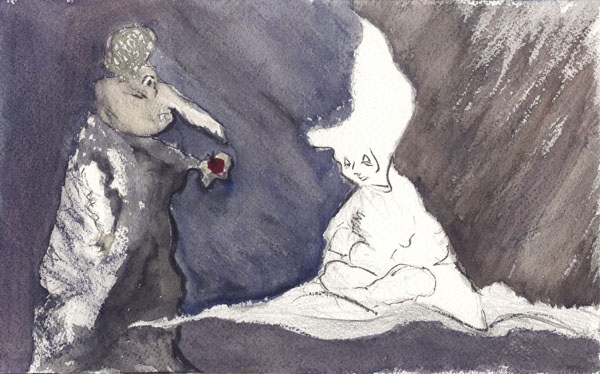 Apple Medium: Watercolor Date Created: February 2009 This is about a dream I had of a creature asking to receive instruction and guidance from an enlightened being. As a gift to the spiritual teacher, the strange creature brings an apple. He asks to become a student. The floating teacher neither accepts or declines. It was perplexing. |
