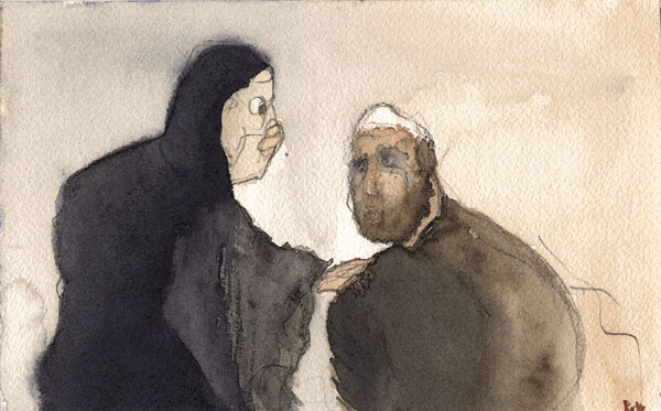 Friends Medium: Watercolor Date Created: February 2009 Is a dream of the student and teacher. Here, the teacher is giving compassion to the student’s sorrows and sufferings. The student suffers from an immense longing to be whole. |