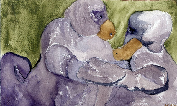 | Title of Work: Infinity Medium: Watercolor Date Created: (not listed) This is a dream of sharing in love which completes, which is whole and tender. The creatures were something like intelligent/aware platypuses. They find each other and they shine with love that is beyond anything known. |