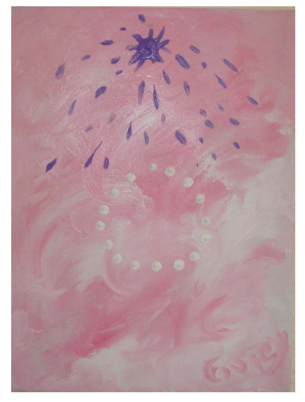 Rêve” - “The Dream Circle” Medium: Oil on Acrylic Date Created: June, 2007 In anticipation of my pilgrimage to France in 2007, I had this dream several weeks before my departure. I was with a group in a circle, and when I looked up high above us I saw a brilliant purple light. The feeling tone of the dream was ethereal and floating. It was as if in my mind’s eye the vantage point was an aerial view. At this pilgrimage, I was asked to assist and facilitate a dream group. Many of the participants had dreams in advance of their voyage, and almost all of the symbols were religious and spiritual in nature. In the process of painting the dream, it seemed natural that the purple light would shower over and illuminate all of us. |
