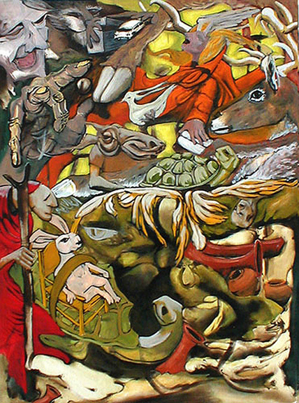 The Polyimagical Realm Medium: Oil Painting Date Created: September 5, 2009 As a dream event 5 Sept 09: I am looking at a yellowish lighted area with visceral silhouettes coming through the light. A deer's hoof comes from above and touches a dove being held by a woman dressed in a red(vermillion) coat with a large collar and shawl, old style riding-coat(like little-red-riding-hood); she has blond-hair and wings growing from the forehead but eyes seem closed and she is older/mid-age woman, wearing lipstick. She holds the dove in one hand and sets her left hand on another white hoof and is facing a witchy-crone who laughs with open toothless month holding a pearl/sphere as if to pass it; she has a hare next to her who holds a bluish box, with an open cover and a car(white), resembling my old station-wagon. The deer is there looking at the event. Next to arrive, a funny long faced creature - an ass, a camel (?). A mixed being of sorts as he has human features/cloths and he is holding another leg of the deer, and a turtle looks back over its shell while walking on feathers (a wing?) next to an angel/man laying, unconscious, on a ledge above a cave. There is light in the cave and it has big earthenware pots, old, some tipped over, some broken, some intact. A priest/cardinal with a staff (forked at top) comes in from the left and next to him a rabbit is strapped to a wooden-chair and onto the back of a tortoise who is moving down near the entrance of the cave but it must be watery because in the shadow I can see a large fish peering out at the tortoise and rabbit, he looks frightening like he is waiting a meal, and the tortoise sees him but is unconcerned WAKE! (5Sept09) Painted in the mid-‘90s, during a time of transition and a failed attempt to relocate to a foreign place my attention and questions were drawn to: the ‘car’ , ‘bound rabbit’ and ‘cave’ guarded by the ominous sea-creature and draped with a ‘fallen angel’. But going back to the image, as in this instance, to exhibit and attach parol evidence, allows me to revisit that period - how I felt and how I resurrected my journey; and what I glanced over in the dreamscape. Those ‘other’ events - fixed in image long ago - now resonate. The ‘particulars’, segments are ‘re-dreamt’; understanding, meaning re-interpreted; the magic of time-spent instructs the painter in the art of journey, life, by untethered brush in day or pillowed in dreams. Yet, simply arrived at on a wall, without pre-emption or explanation, its magic and myth might provoke transformation in any viewer. |