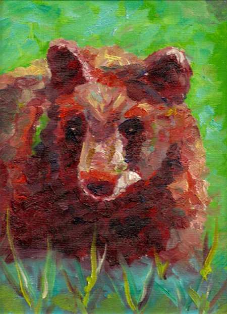 Dream Bear Medium: Oils Date Created : August 12, 2009 I chose this dream at Robert Moss's workshop during the IASD2009 conference in Chicago. I vowed to make an oil painting of a bear. Also, my last name means "of the bear." Dream: Black bear growling covers my back with his fur. Wraps himself around me. I become bear. I run through the field as bear, to the waterside to catch a fish in my teeth. |