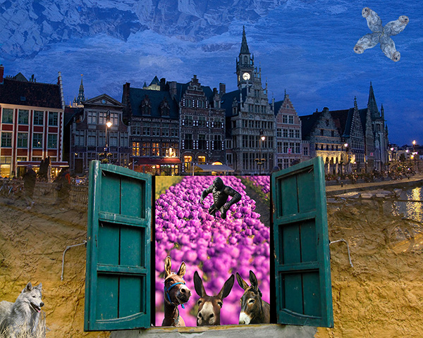 Belgium - Awakening Medium: Photography, Digital Collage Date Created - February 2009 Dream Text: I wake up in a bedroom. The paint is light maybe yellow and it is very calming here. I turn in bed and look out the window. The window is smaller than a normal window and has a lot of grime around the edges so I can only see out a small area in the center. I look outside and it is one of the most beautiful scenes I have ever experienced. We are in a house and I am looking out the backyard. The house is probably on a cliff side or high hill because it seems the furthest ground below is a long way down. The yard area is yellow like a spring meadow with some purple flowers scattered about. Then there are is a small area of beach or sand or rocks and then the ocean. The most amazing part about this scene is the abundant wildlife around. There are three or four donkey's lounging about on one side of the yard. I see creatures jumping in and out of the ocean that are otters or maybe seals. There is another strange creature walking through the water. It looks a bit like a gorilla. I looked out again - the gorilla animal came out of the water and was a wolf with a chain on as if it was a pet or someone did not want it to roam wild - it could walk around a certain area of the yard but was chained. Now the scene changed and it looked more like a European city - I say this because there was a river and the buildings looked like a style older than most US cities. This time we were even higher up from the ground and I could see quite a ways around me. While it was not as beautiful as the previous scene, there was a charm surrounding the area. It made a good photo op as there was so much going one (since I could see so far). |