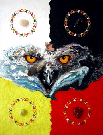 Title of Work: World of the Fifth Hoop Medium: Mixed Media 11" x 14" Date Created: 2006 World of the Fifth Hoop pays tribute to the whale and bird messengers who came into my dreams and to the Aleut elder, Ilarion Merculieff, who helped me understand them. The title refers to the prophecy of the Fifth Hoop in which humans from the Four Directions come together to share the sacred and secret teachings once more. Read the prophecy here: http://www.viewzone.com/alaskan.html Date of dreams: fall, 2005 |