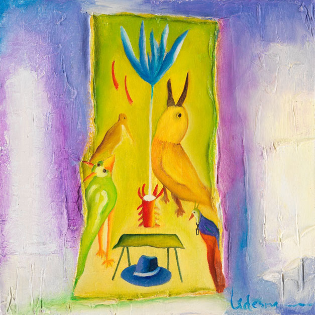 A table, a hat, and a floating vase Medium: Oil on canvas Date Created: 10/2/2008 "where is the hat?" a group of older men are talking in the room. one of them is Joe- although he does not look like Joe. He has lost his hat and I know it. I see him looking for it. I know that the hat is under a table. Even though I think it is obvious where the hat is, he does not see it. I wait for him to find it. |