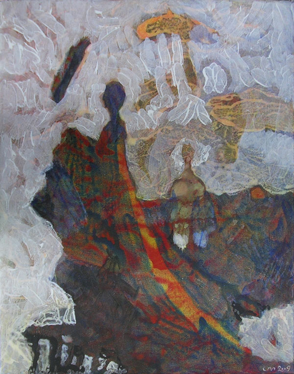 Ninth Dream Medium: Acrylics on Canvas Date Created: 2009 The painting is not about a particular dream. For me it represents the spirit of a dream - it may not be dreamed yet, or may be forgotten, or may belong to someone else. In my work I try to create dream-like spaces which emerge and show through the process of painting. It becomes vital to not interfere but to assist and step aside at the same time while observing, like one would observe and become aware of the dream, the unfolding of the inner landscape. To me, the painting speaks about the mystery which permeats everything, and is so natural in the dreaming experience - a mystery that is not to be deciphered. And it's like we already hold the key; it's just not a key that leads to explanations, but one that takes us deeper. |