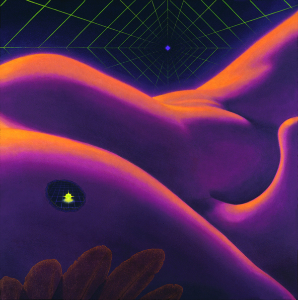 The Matrix Medium: Acrylic Date Created: 2003 I am with a group of people in a large building. We are on the top floor looking out into an atrium that reaches from the ground floor to the roof. We are to be shown a sacred object. The object is suspended before us in the atrium. It is like a large ornament that would be hung on a Christmas tree. It seems to be the figure of a young boy in ceremonial dress; it is golden and jewel encrusted. A man describes the object and then says the viewing is over. I see other features on the back of the ornament and ask the man why he hasn't talked about them. He denies they are there. I take the object and show the others what I see. One thing is the head of a king wearing a crown and the other is a dove. Including the boy, this makes three features but for me there is a fourth thing and that is their matrix, the space they are suspended in. The matrix is the numinous thing; it is a great height or a great depth depending on your perspective and also the quality of the light. |
