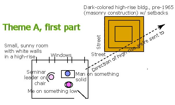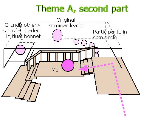 I Attend a Seminar, Leader Drives a Citröen Medium: Digital graphics Date Created: 2005 ![]() ![]() Theme B Out on the street. It's no longer a high-rise area; now the buildings are attractive, expensive, single-story offices, rough dark wood. I get in the driver's seat (?) of a (?) small minivan. A bunch of young, dark-skinned (?) men pile in, noisily, excited and joking. (Feelings) [No notes] Frazzled? Curious about and kind of enjoying the joking around. But maybe I also feel put-upon The younger woman who led the seminar and the man rush past in a bright-colored (green? red?) Citröen, squeezing dangerously between us and the curb, having fun. (Feelings) I enjoy the excitement. [Illegible] of danger outweighed by being impressed by the woman's style. ![]() Comments from the artist: Citröen, red or green - (8/2/05, immediate) I have no idea where this came from. I did a bit of Googling and couldn't find any meaning other than just the car (although it certainly has fans). (11/10/05, revised) Bringing Montague Ullman to his IASD / Friends of the Institute of Noetic Sciences talk this evening, Emily driving her SUV—as we drove down the West Side Highway, Monte teased Emily about driving like a taxi driver. It was a pretty wild ride, dodging in and out between lanes in a big hurry, and Monte—although holding on tight with both hands—said he was having a great time. He said that’s the route he took to work for so many years when he headed the psychiatry department and ran his sleep lab at Maimonides Medical Center in Brooklyn.. For some reason, I asked him what kind of car he drove. He said a Citroen!! He loved that car. Emily asked what color it was, and was surprised he couldn’t remember the color of a car he loved. He said it was either red or green. |