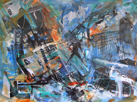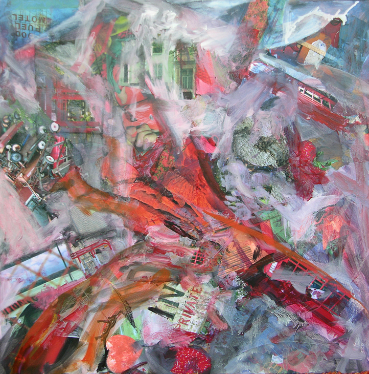 City Super Hero Medium: Acyrlic Paint & Digital Photo Collage Date Created: 2009 The city is in ruins, buildings towering above, falling precariously in all directions. A small white figure on the bottom right walks a tight rope with arms outstretched. There is a strong female figure standing with feet planted firmly at the center of the chaos her long ponytail blowing in the wind, her hands of hips. READY. |