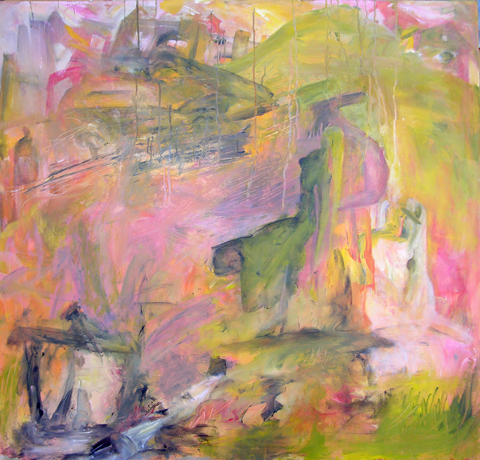 Castle on the Hill Medium: Acyrlic Paint & Digital Photo Collage Date Created: 2009 On the top of the hill to the left is a castle with turrets, drawbridge and flags flapping. Robed figures are climbing the path to the castle. On the opposite side of the hill a lone house with the all knowing eye watches all. A river emerges from a cave and runs by the tunnel entrance at the base of the hill were a lone figure enters, light illuminates from within the tunnel. A white horses head comes straight up from the ground while a couple dance tango on a table over the abyss. |