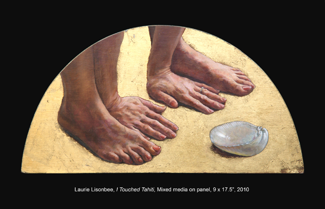| Title of Work: I Touched Tahiti Medium: Oil and Gold Leaf on Panel Date Created: 2010 Whenever there is an impending shift in my artwork, I feel lost, restless and unsteady. I knew my art was ready to go off in a new direction involving the human figure, but what? In this state of uncertainty, I had pondered and questioned for several weeks - what was to be the context, meaning or subject in my figurative paintings? One morning, with no thought at all of my artistic struggle, I was meditating in my favorite mental setting: I conjured up in my mind a golden sand beach on a Polynesian island. I dozed off and dreamed of a simple yoga pose of hands and feet aligned and firmly planted on the earth in a sandy tropical island setting. I awoke with the clear understanding that my next body of work was to be paintings of yoga poses. The body postures would be an unlimited mine of imagery from which I could metaphorically express a range of states of being. As in yoga and as in life, the human experience can be balanced, awkward, convoluted, twisted, relaxed, tense, erect, supine, open, closed, etc. In my dream, the hands and feet are side by side, bespeaking their equality of usefulness and yearning for groundedness. Thus began a series of paintings of yoga poses, in which I hope viewers can experience states of being, something akin to meditation as in yoga practice. ![]() |