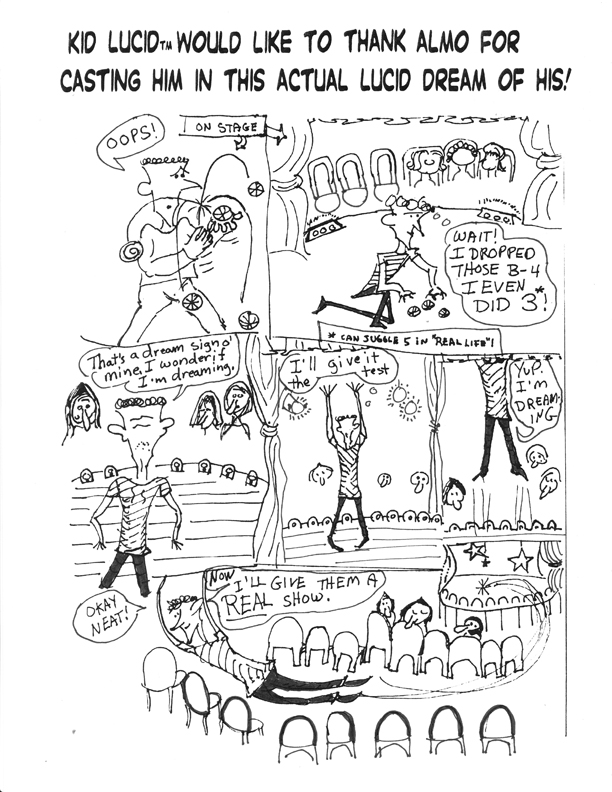 | Title of Work: Kid Lucid Medium: Illustration Date Created: 2010 ![]() ![]() This is an early and primitive version of Kid Lucid used to illustrate an actual early/primitive lucid dream of his writer/cartoonist - almo (aka Allan Moniz or sometimes even A D Moniz.). The rest I believe is self-evident.... ![]() ![]() Alternate Ending ![]() |
