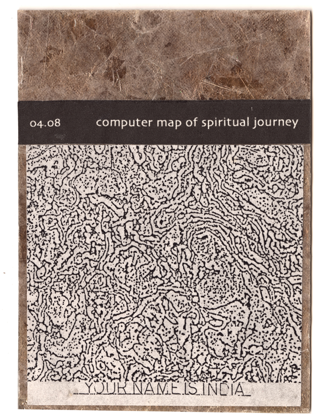 visual dream journal Medium: Collaged paper on mica panel Date Created: April, 2008 In waking life, I have two friends, women, who are psychiatrists, neither of whom shows the slightest interest in dreaming or the spiritual life. In this dream, however, they have a new practice together, and its spiritual. They gather information from a client, run it through a computer, and out comes a unique drawing that explains the client's life path. Of course it takes many sessions to help the person understand and resolve it all, and I don't have the money to participate. But since I'm a friend, they decide to let me do the first part; they input my data and I see a wonderful page a black-and-white line drawing with objects and details interwoven in a map-like pattern. Since I wont be working with them, they don't give it to me, though one feature I recall clearly is my spiritual name: India. I wish I could remember more, and am sad to wake and leave the image behind. ![]() |