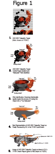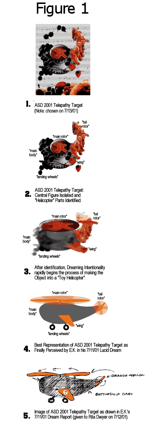 References 1. Kellogg III, E. W. (1985). “The Substitution Phenomenon”. Dream Network Bulletin, 4(5), 5-7. 2. Kellogg III, E. W. (1989). “Mapping Territories: A Phenomenology of Lucid Dream Reality”. Lucidity Letter, 8(2), 81 - 97. 3. Kellogg III, E. W. (1992). “The Lucidity Continuum”, a paper presented at the Eighth Annual Conference of the Lucidity Association in Santa Cruz, June 28, 1992. Copies of this paper available from the author by request. © 1992 4. Kellogg III, E. W. (1997) “A Mutual Lucid Dream Event”, Dream Time, 14(2), 32-34. 5. Kellogg III, E. W. (1999). “Lucid Dreaming and the Phenomenological Epoché ”, paper presented at the Society for Phenomenology and the Human Sciences conference in Eugene, OR in October, 1999. Copies of this paper available from the author by request. 6. Swann, I. (1991), Everybody’s Guide to Natural ESP: Unlocking the Extrasensory Power of Your Mind, Jeremy P. Tarcher, Inc., Los Angeles. 7. Graff, Dale E. ( 2001). “Learning from Psi Dreams”, Dream Time, 18(1), 14, 15, 33. 6/26/01 Linda Magallón completes the final versions of the 4 target pictures for the 2001 telepathy contest and makes color copies. 7/11/01, ~ 6 AM I have a long lucid dream in which I try to tune into the ASD 2001 Dream Telepathy Target. After apparently succeeding in doing so, I wrote down my experience in detail, which includes a colored sketch of what I had perceived as the target image. 7/12/01 ~ 10 AM After finally locating a copy machine on the U.C. Santa Cruz campus, and making a copy of the dream report for myself, I give the original dream report to Rita Dwyer. 7/13/01 ~ 10:30 PM The sender blindly selects a specific target picture, out of a target pool of four. 7/14 ~ 9:30 AM The four possible target picture images displayed on a table in the ASD Computer Cafe’. Only one picture has the form and coloring of the image seen in the dream of 7/11/01. I submit a copy of my original account, with some prefatory notes on a separate page indicating my choice, and add some notes to the margins of a copy of the original account. Congruencies and Incongruencies of the Target Picture and the Intentionally Manifested Dream Object. Structural Level Congruencies: 1. Target Picture’s Central Image (TPCI) isolated/floating contrasted with a white background. Manifested Dream Object (MDO) first seen isolated/floating against the background of a white lightning flash. 2. TPCI shaped like a comma lying on it side. MDO shaped like a comma lying on it side, same orientation as TPCI 3. TPCI general color dichotomy gray- blue and orange-brown-red MDO color dichotomy gray and orange-yellow. 4. TPCI patches of orange-brown-red color on the top of the main body shape and on the end of the tail. MDO patches of orange-yellow color on the top of the main body shape and on the end of the tail. 5. TPCI gingerbread man in cup “circular rotor” shape on top of middle of main body. MDO circular “helicopter rotor” shape on top of middle of main body 6. TPCI implied motion: a spiraling, circular swirl. MDO motion: whirling of the “helicopter blades”, circular spiraling motion around the room of the “afterimage helicopter”. Incongruencies: 1. The Target Picture had a lower “border” ground area, similar in its components and colors with the TPCI. MDO did not have a lower border area. 2. White background around the TPCI had fine structural elements (the bars and notes of a musical score.) MDO white lightning flash background undifferentiated, no repeating horizontal lines. 3. The Target Picture had many contributing structural elements in a very complex arrangement. MDO “toy helicopter” simple and much less differentiated - with only five structural elements.